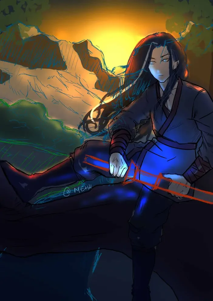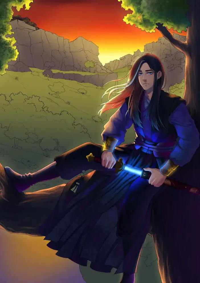 I didn’t want the sky to overshadow the details and effort poured into the drawing, nor to distract from the title. I tried making the oranges more pink, adding a glow to the character’s sword as if infused with power, darkening the background using multiple layers, and even adding a glow around the character to increase contrast. Nothing seemed to work.