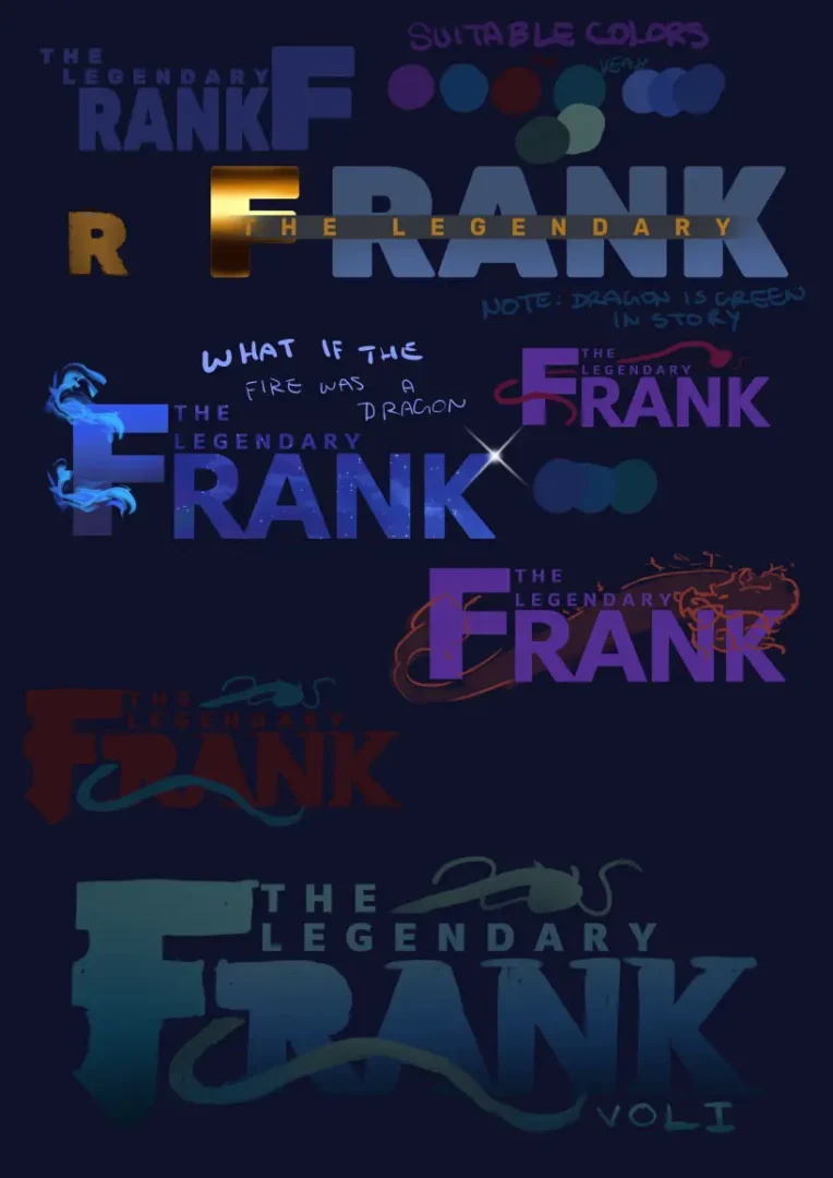 I worked through several more sketches and brainstorming sessions, gathering feedback from others. There were key factors to consider, such as making the text readable across various platforms and ensuring it complemented all three covers in the trilogy. An unexpected challenge was that people often read it as “The Legendary Frank,” which was amusing at first but quickly became an obstacle.